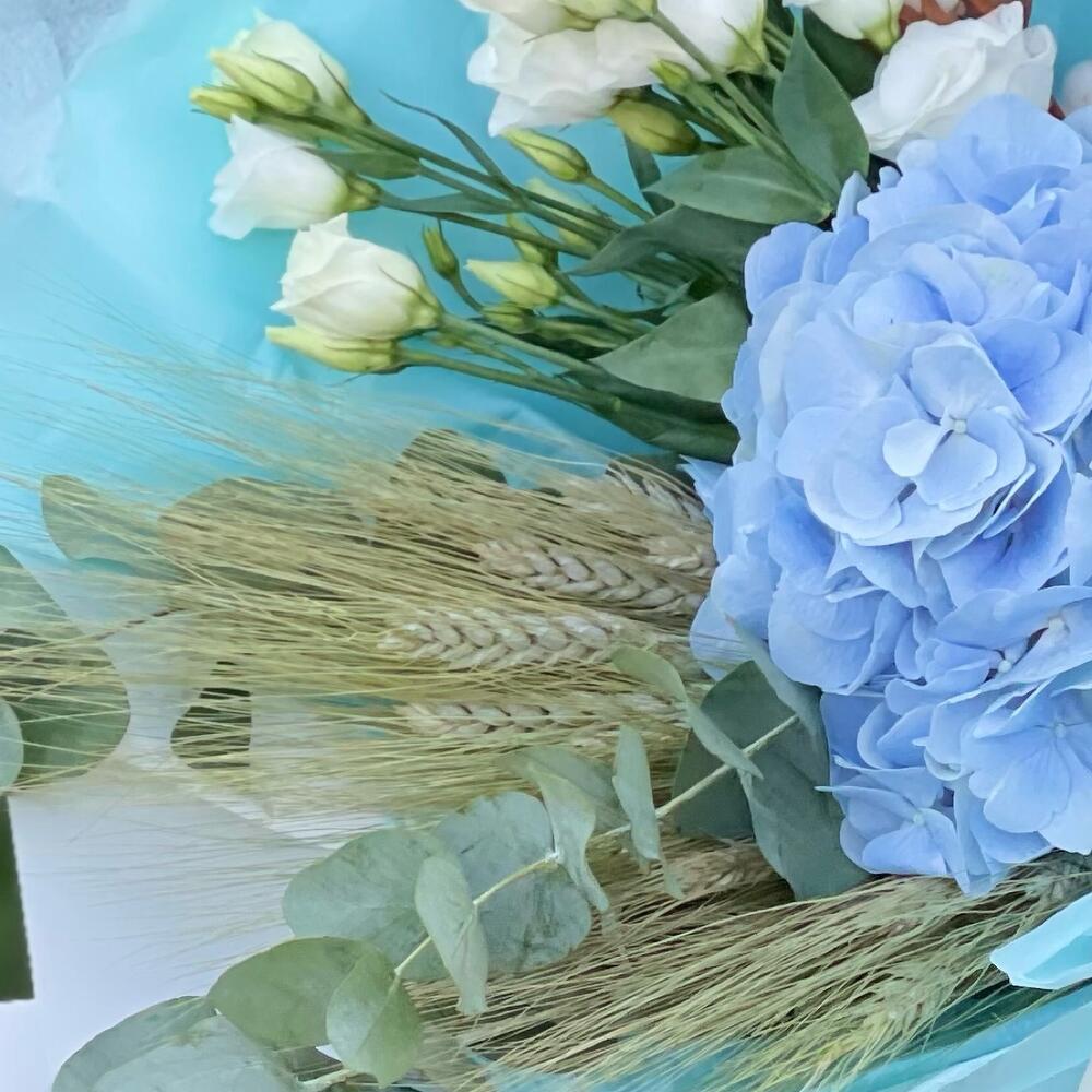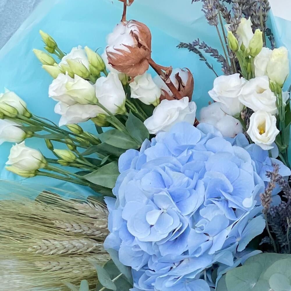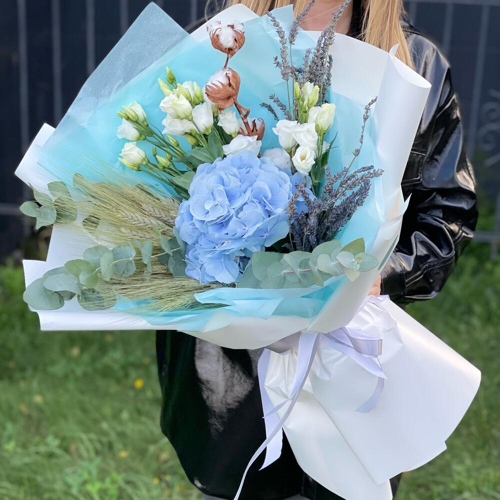 Хлопок - 1 шт. Гортензия - 1 шт. Эвкалипт - 1 шт. Эустома - 3 шт. Колоски - 5 шт. Лаванда - 15 шт.