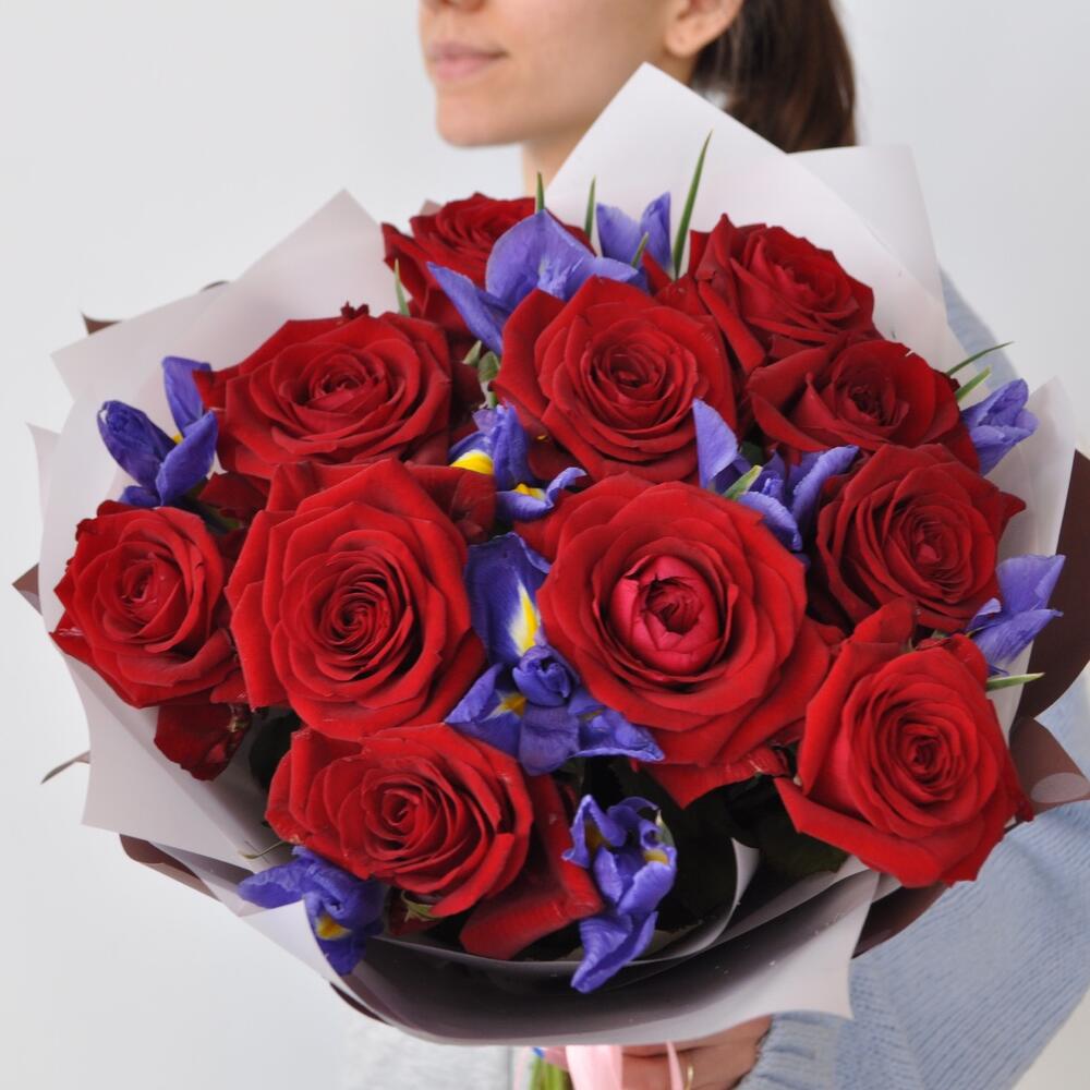 Ослепительное сочетание красных классических роз с необыкновенным ароматом и ярких ирисов. Букет, словно вишнёвый джем, подарит сладкий аромат и тёплую улыбку вашему получателю)