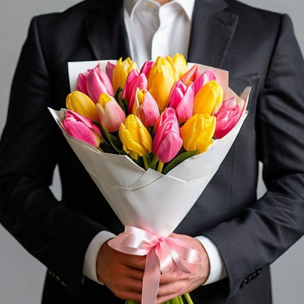 Яркий букет из тюльпанов – розовые и желтые 💛🎀